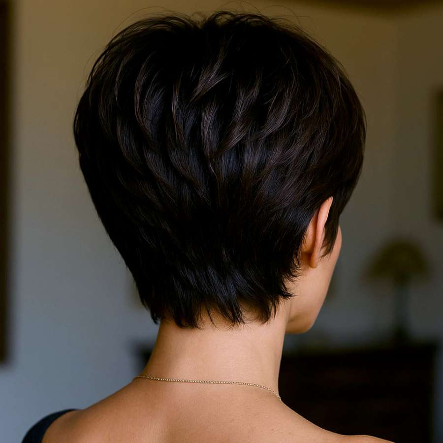 From the back, this pixie cut reveals its true craftsmanship. The layered structure builds volume naturally while maintaining a clean and refined neckline. Each layer adds a soft, feathered texture that prevents flatness and keeps the hairstyle lively from all angles. The gradual tapering ensures a snug fit around the nape, giving it a tailored feel. This look is perfect for those who prefer neat hairstyles with depth and detail. It’s practical for everyday wear, yet stylish enough to impress in more formal settings.