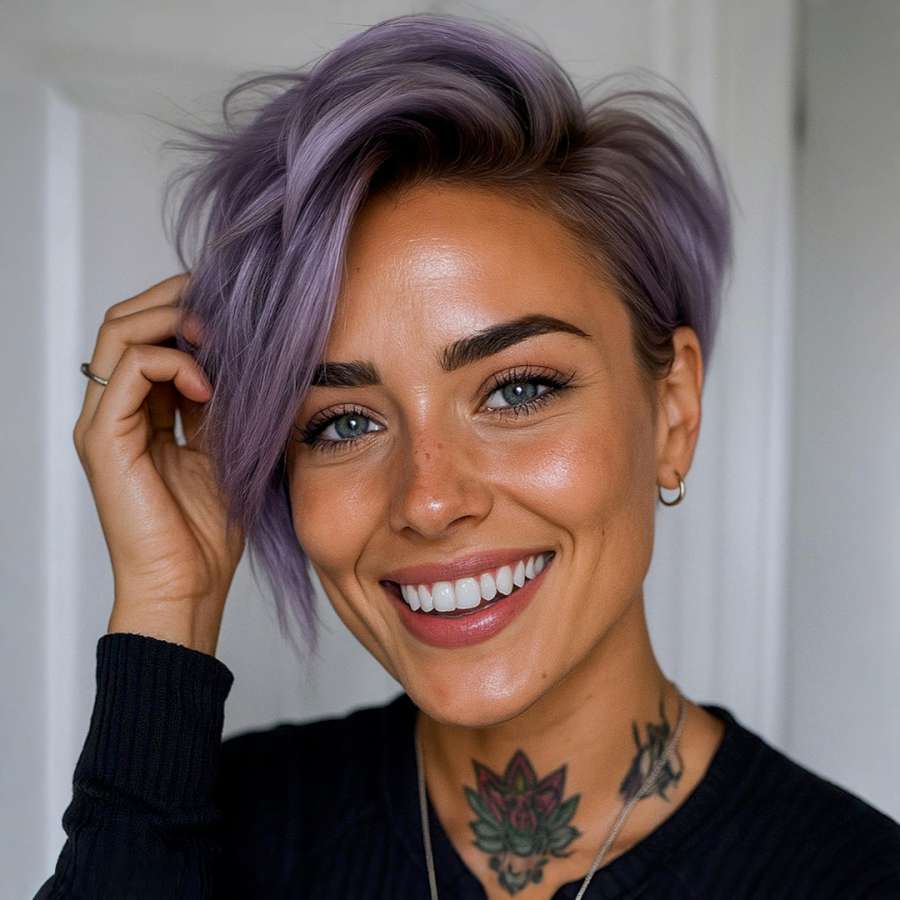 This short hairstyle stands out with its striking blend of volume, texture, and pastel elegance. The cut follows the classic pixie structure but is updated with a longer fringe swept dramatically to the side. This not only adds a touch of softness but also creates an elongated visual line across the face—flattering for most face shapes, especially oval and heart-shaped. The hair is blow-dried with volume at the crown, giving it a modern, airy finish that doesn’t fall flat. What truly makes this look unforgettable is the unique lavender hue. The color choice reflects individuality, making it perfect for trendsetters and creatives. Ideal for anyone seeking a low-maintenance cut with high style impact, this pixie also works well with fine to medium hair textures. It pairs beautifully with bold accessories and shows off tattoos or neckline details thanks to its cropped sides and back.