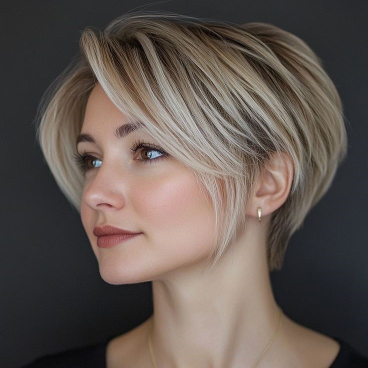 This softly layered bob exudes elegance and sophistication, making it a perfect choice for those seeking a timeless yet modern look. The subtle layers add depth and movement, giving the hair a natural lift without sacrificing sleekness. Face-framing highlights in a soft blonde shade illuminate the complexion, enhancing the facial features and adding warmth. The cut is slightly longer in the front, which elongates the face and creates a flattering silhouette ideal for round or heart-shaped faces. This bob is versatile and easy to style, requiring just a bit of smoothing serum and a quick blow-dry to maintain its polished appearance. Ideal for both professional and casual settings, this hairstyle strikes a balance between classic beauty and contemporary charm.