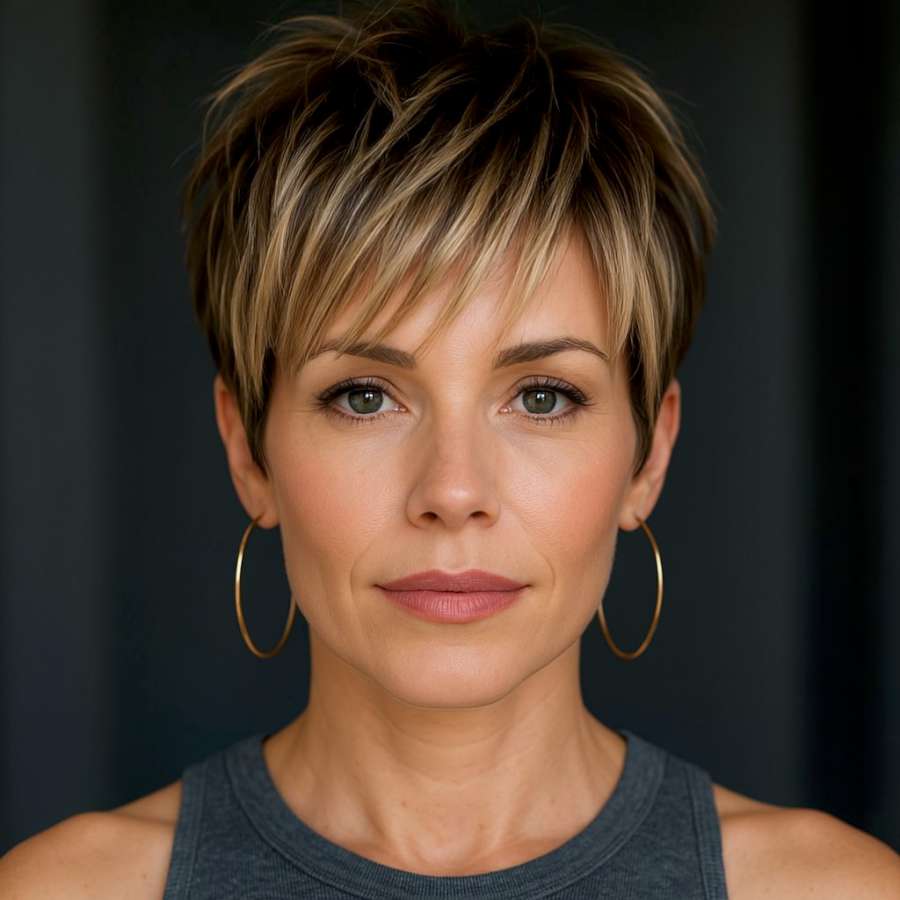 This textured brunette pixie cut with honey blonde highlights offers the perfect blend of sophistication and edge. The finely layered top adds volume and natural movement, while the slightly longer fringe brings softness and frames the face effortlessly. The warm blonde highlights break up the rich brunette base, creating depth and a sun-kissed effect that brightens the entire look. Ideal for women who want a low-maintenance yet fashion-forward style, this cut works beautifully with straight or slightly wavy hair textures. The tapered sides and back keep the silhouette sleek and neat, enhancing the overall structure of the face—especially flattering for oval and heart-shaped face types. Whether styled messy or smooth, this pixie exudes confidence, energy, and modern elegance.