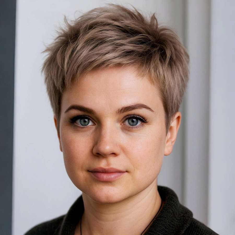 The front-facing view highlights the sophistication and confidence of this chic pixie cut. With its neatly cropped sides and voluminous top, this style strikes the perfect balance between edgy and elegant. The ash beige hue adds a contemporary touch, keeping the overall look fresh and versatile. Suitable for women with oval, heart, or square face shapes, this haircut frames the face beautifully and draws attention to the eyes and cheekbones. It’s a great choice for those who prefer a low-maintenance yet stylish look that can be dressed up or down. The soft texture on the crown allows for a bit of play in styling—whether you want to go sleek or tousled. This pixie cut is ideal for women who embrace modern femininity and want to make a confident impression.