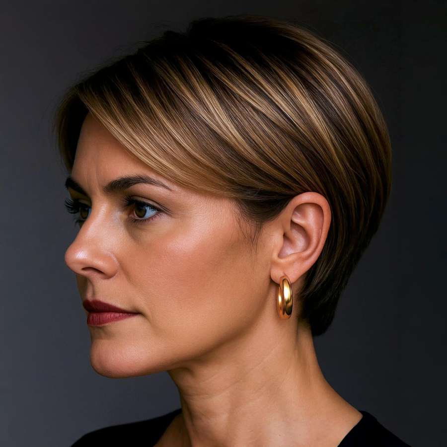 This pixie bob is a fusion of playfulness and refinement. The top is layered for volume and movement, while the tapered nape keeps the look clean and structured. The sides gradually frame the face, making it a flattering choice for many face shapes—especially round and heart-shaped. Golden highlights are delicately placed to catch the light and add dimension to the rich brunette base. This style exudes confidence and charm, ideal for women who want a manageable yet statement-making haircut. Whether you’re heading to a meeting or a dinner date, this cut transitions seamlessly and requires minimal styling. A few strokes with a round brush or texturizing cream are enough to keep it looking fresh all day long.