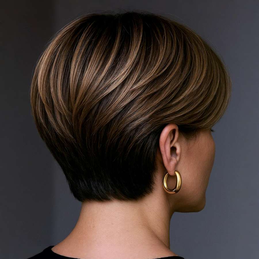 From the back, this short bob shows off impeccable craftsmanship. The stacked layers build subtle height at the crown while tapering down smoothly toward the nape, offering both volume and structure. The undercut at the base adds contrast and keeps the neck area light and clean. This design is ideal for women who want a haircut that looks as impressive from behind as it does from the front. It’s especially suited for straight hair, as the sleek lines are best appreciated when smooth. With its understated sophistication, this cut complements both casual and formal looks. Paired with gold hoop earrings or a minimalist neckline, it becomes a standout choice for those who value both practicality and refined aesthetics.