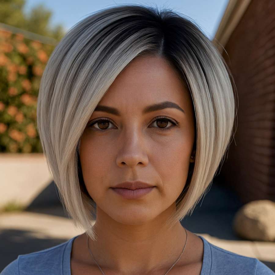 This ash blonde angled bob is the perfect blend of sophistication and edge. The dark roots create depth and dimension, while the icy tones of blonde soften the overall look. Cut to hug the jawline and parted in the middle, this style flatters oval and heart-shaped faces the most. It’s a low-maintenance yet bold choice for anyone looking to refresh their look without going overboard. Great for both professional settings and casual hangouts, this bob commands attention through clean lines and cool hues.