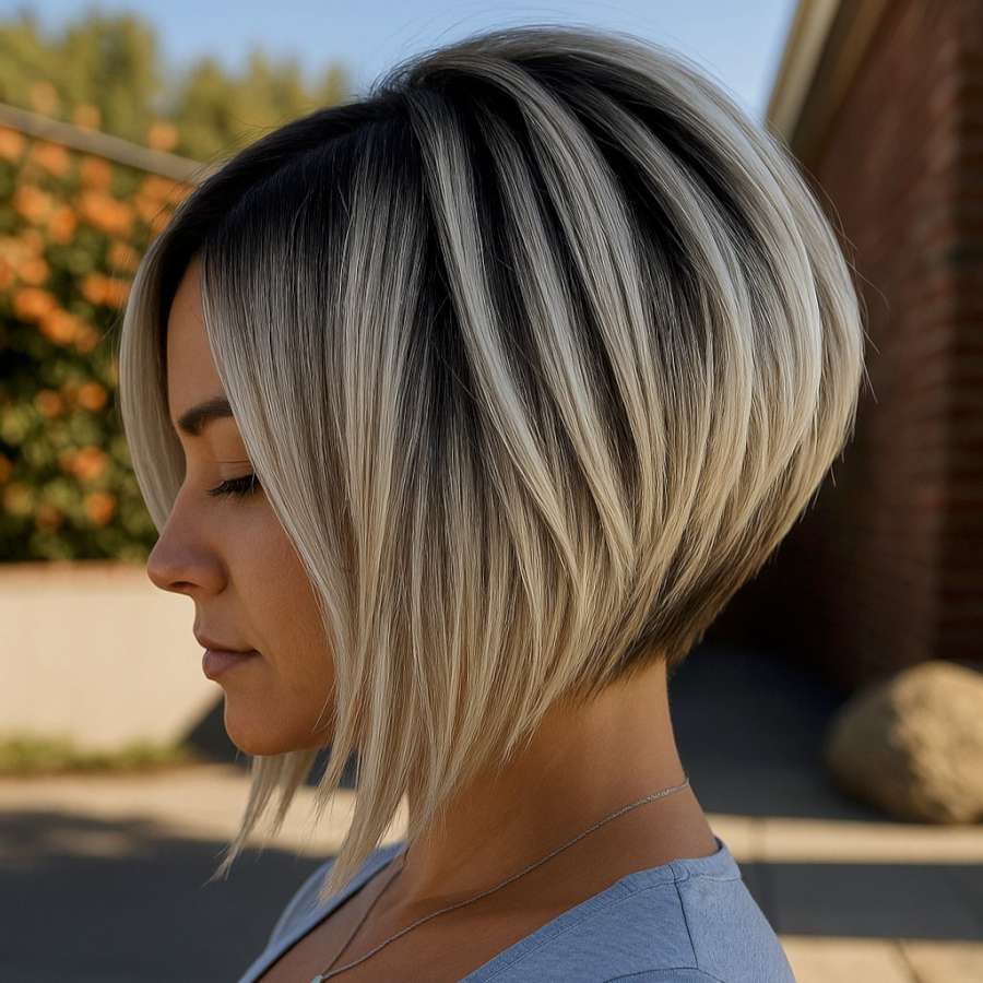 Viewed from the left, this graduated bob reveals its well-crafted architecture. The back is stacked just enough to create natural volume, while the front remains long and smooth. Its ash blonde tones are layered with lighter and darker streaks, adding texture without disrupting the clean lines. Ideal for women who want structure with a feminine flow, this haircut works well for medium-density hair and suits narrow and elongated face shapes. Blow-drying with a round brush will enhance the natural movement and lift.