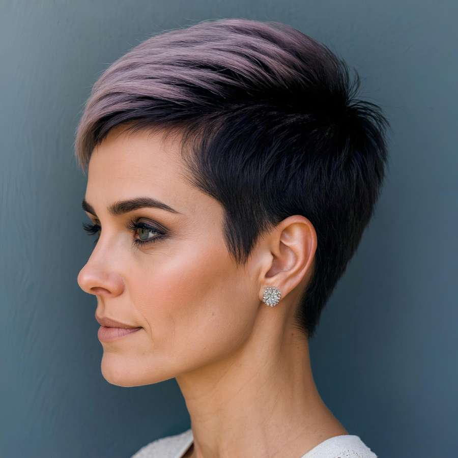 The left side profile showcases the clean artistry of this modern pixie cut. The smooth transition from the faded undercut to the textured lavender top creates a dynamic silhouette. The longer layers on top are styled diagonally forward, adding movement and an edgy yet elegant look. This angle emphasizes the precision fade and the sharp detailing around the ear, making it ideal for showcasing earrings or facial structure. Women seeking a bold yet graceful look will find this style empowering and refreshing. Its artistic color blend and professional styling make it a standout choice for trend-conscious individuals.