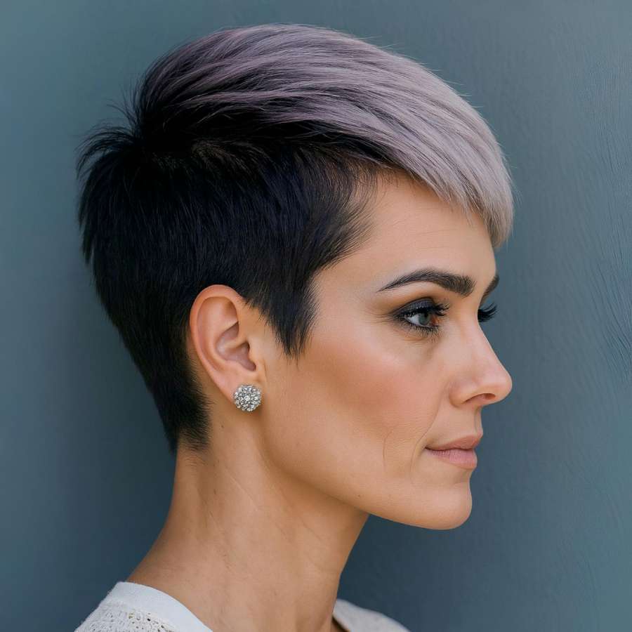 Seen from the right, the haircut reveals its true contour and finesse. The lavender top seamlessly merges with the darker undercut, forming a gradient effect that adds dimension and depth. The strands are styled forward with slight lift at the crown, creating a soft wave and modern texture. This look is ideal for those who appreciate both sharp cuts and feminine elegance. The expertly faded temple area and tapered neckline reflect high precision. It’s a flattering style for those who want a neat, defined appearance without sacrificing bold character.