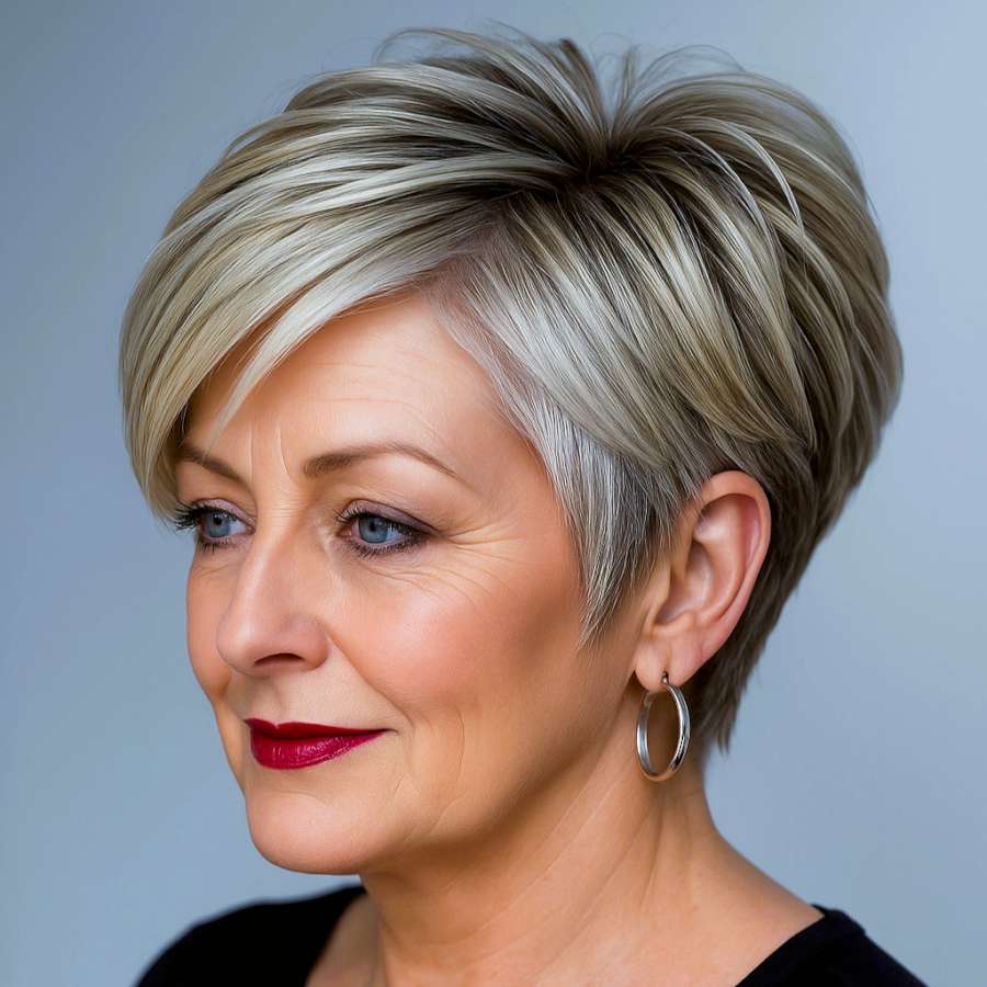 This sophisticated layered pixie cut is the perfect blend of timeless elegance and modern flair. Featuring a voluminous crown and delicately tapered sides, the haircut enhances natural bone structure while offering a youthful lift to the face. The soft, side-swept bangs add a touch of femininity, gently framing the eyes and creating a flattering contour across the cheekbones.