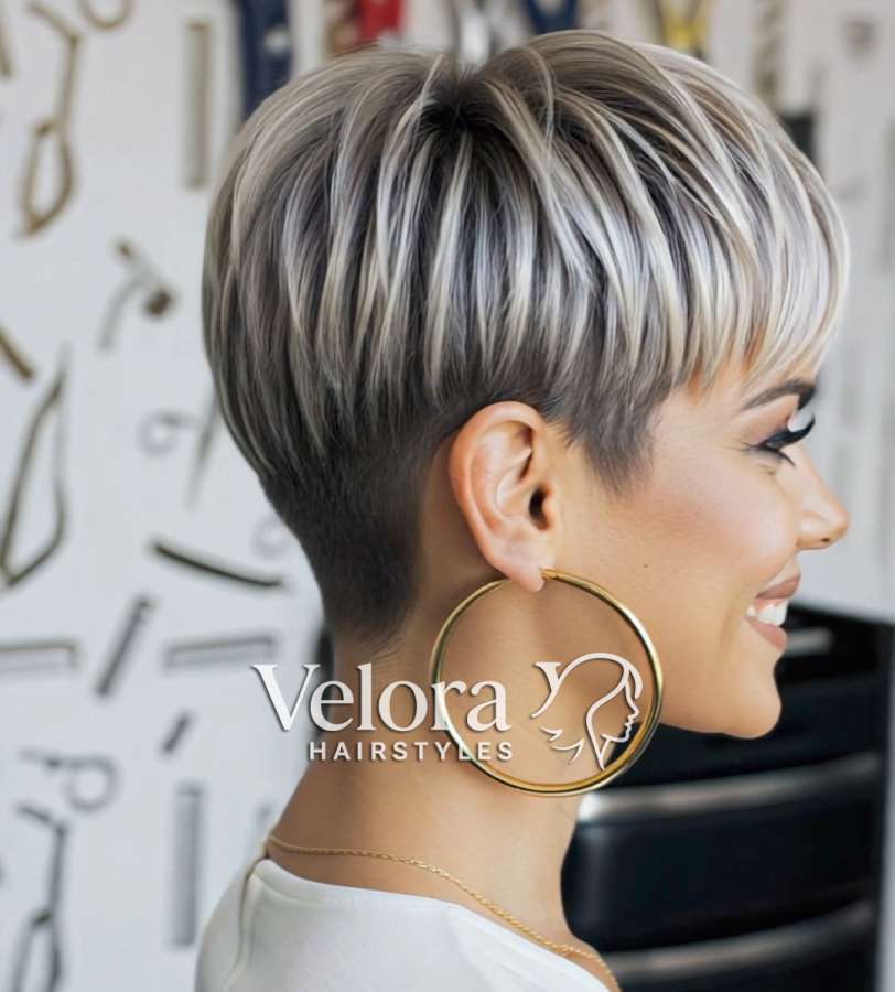Viewed from the side, this tapered pixie is a masterclass in balance and precision. The shorter, neatly faded undercut at the nape contrasts beautifully with the longer top layers, creating a refined shape that hugs the head naturally. The color plays a major role here — soft platinum tones merge with cool silver hues, adding dimension and sophistication. This cut complements sharp jawlines and high cheekbones, giving a chic and confident edge to the face. Its low-maintenance nature makes it ideal for modern women seeking both convenience and elegance. A light styling cream or texture spray can emphasize the layers and preserve the fresh salon finish throughout the day. It’s a timeless yet trendy hairstyle that never fails to make a statement.
