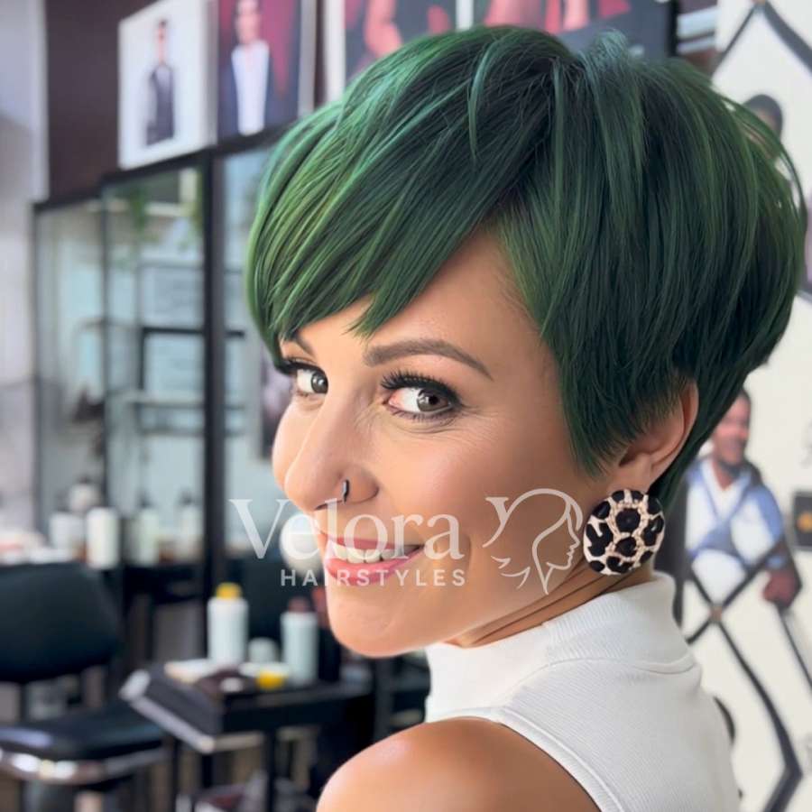 From this side profile, the emerald pixie shines with bold personality and precise styling. The layered cut hugs the natural head shape, creating lift at the crown while tapering neatly toward the nape. The longer side fringe softly frames the cheekbone, bringing out the eyes and smile with effortless charm. This hairstyle balances edge and femininity — perfect for creative spirits and confident women. The deep green tone adds modern energy, while the layers keep it lightweight and easy to style. A quick tousle with matte pomade or texturizing spray enhances texture and volume. Whether worn sleek or playful, this look radiates individuality and timeless cool.