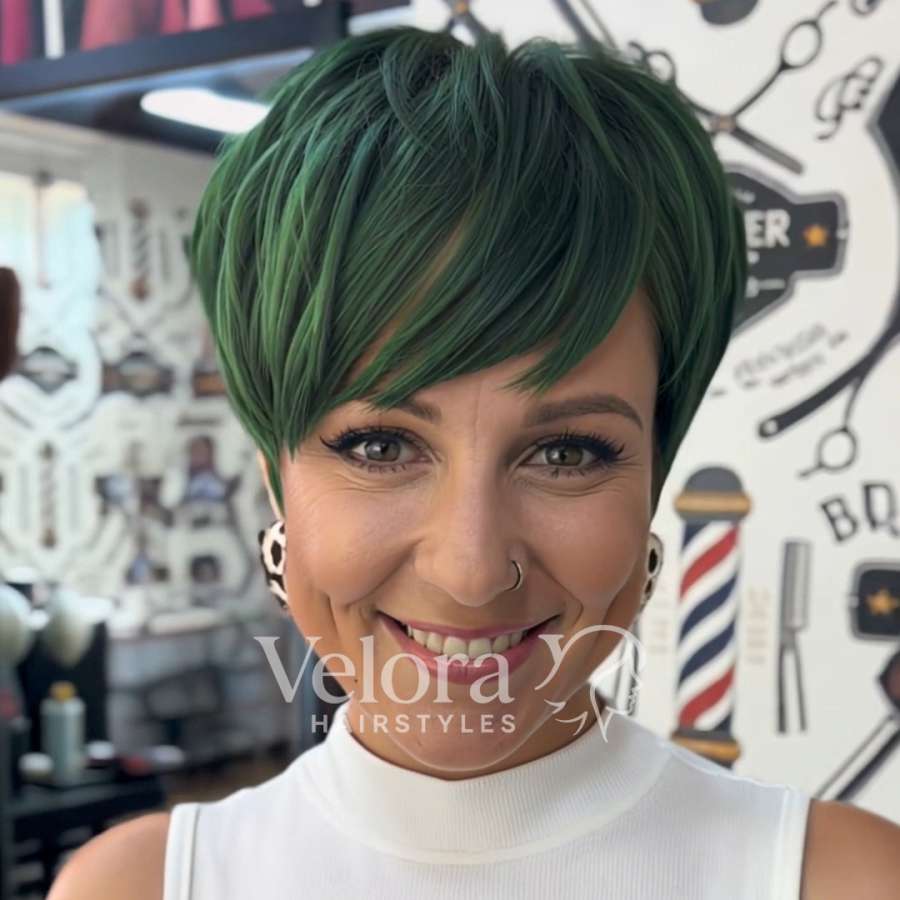 Seen from the front, this emerald pixie haircut captures the essence of modern boldness. The asymmetrical fringe draws attention to the eyes while adding softness and motion. Its texture and volume are carefully sculpted to maintain a lightweight feel, perfect for everyday wear. The vivid green hue symbolizes confidence, creativity, and a fearless sense of style — traits that define today’s trend-forward short cuts. With subtle root shadowing and ash undertones, the color looks dimensional under natural or salon lighting. Pair it with statement earrings or minimalist outfits to make the color pop even more. This hairstyle proves that short hair can be both daring and undeniably elegant.
