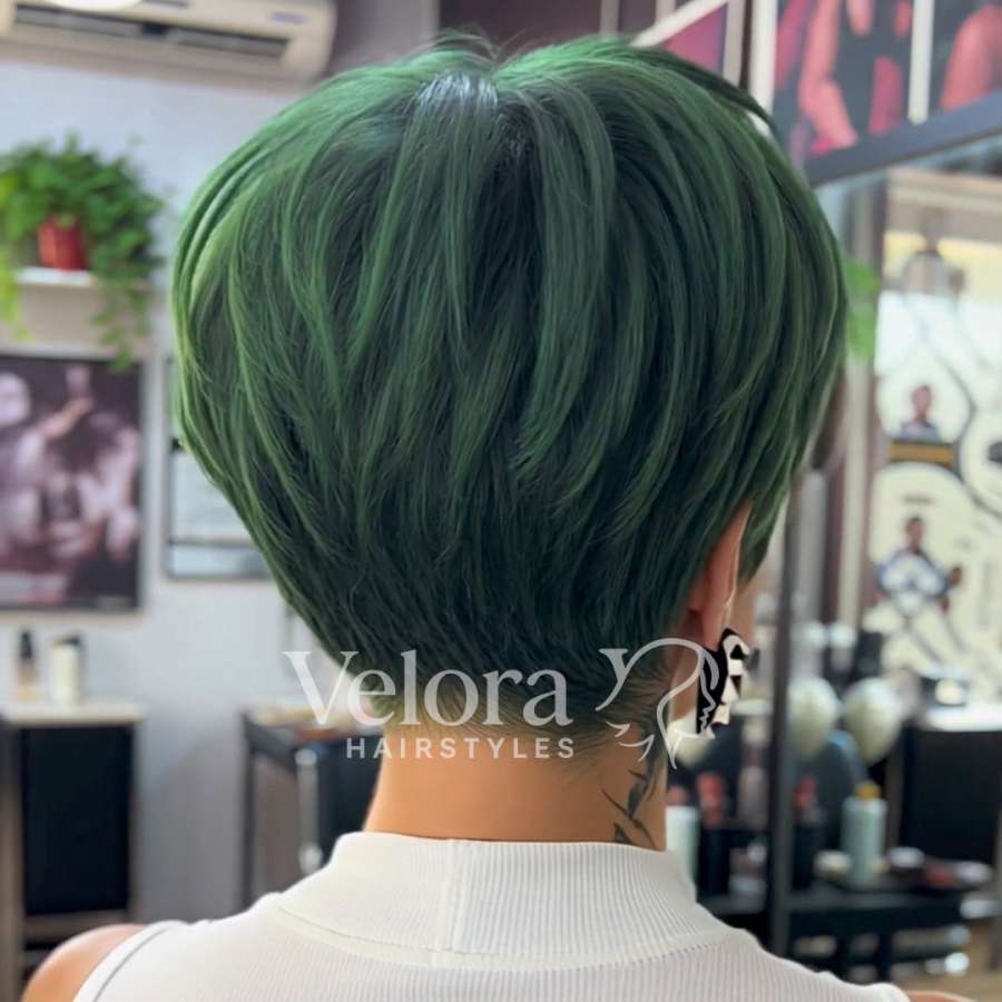 The back angle of this emerald pixie showcases pure craftsmanship. Each layer transitions smoothly from crown to nape, creating a rounded yet airy silhouette. The tapered finish at the neckline keeps the cut fresh and easy to maintain, while the soft green gradient enhances depth and shine. This structure-focused design gives the hair body and movement without heaviness — ideal for fine to medium textures. The precision cut ensures the style holds its shape even after minimal styling. Combined with the vibrant emerald shade, this look becomes a symbol of artistry and individuality. It’s a statement of confidence for anyone who loves clean, modern lines and expressive color.