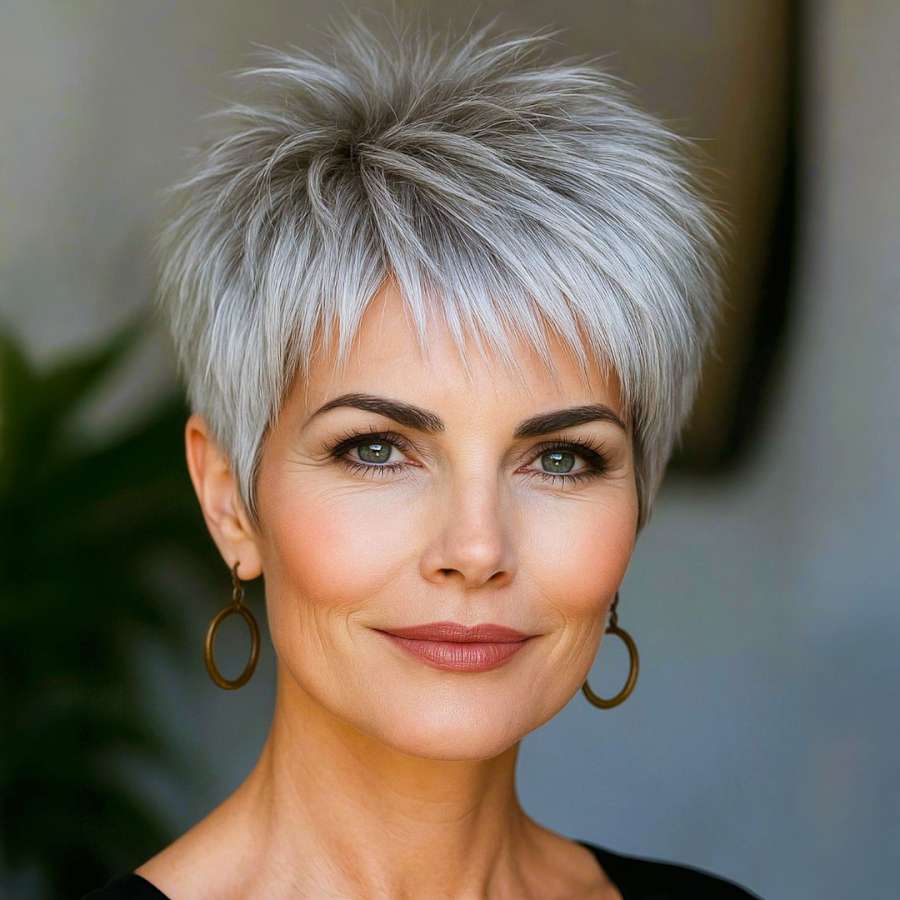 This voluminous silver pixie cut is a bold and stylish choice, featuring spiky layers that add height, energy, and movement to the look. The sharp, feathered ends create a light and airy silhouette, while the cool silver tone adds a modern, high-fashion edge. The fringe is delicately pointed and slightly tousled, drawing attention to the eyes and cheekbones. With its lifted crown and well-structured sides, this haircut flatters mature women who love to showcase confidence and individuality. Perfect for those who want a low-maintenance yet high-impact style, this pixie radiates empowerment and timeless elegance.