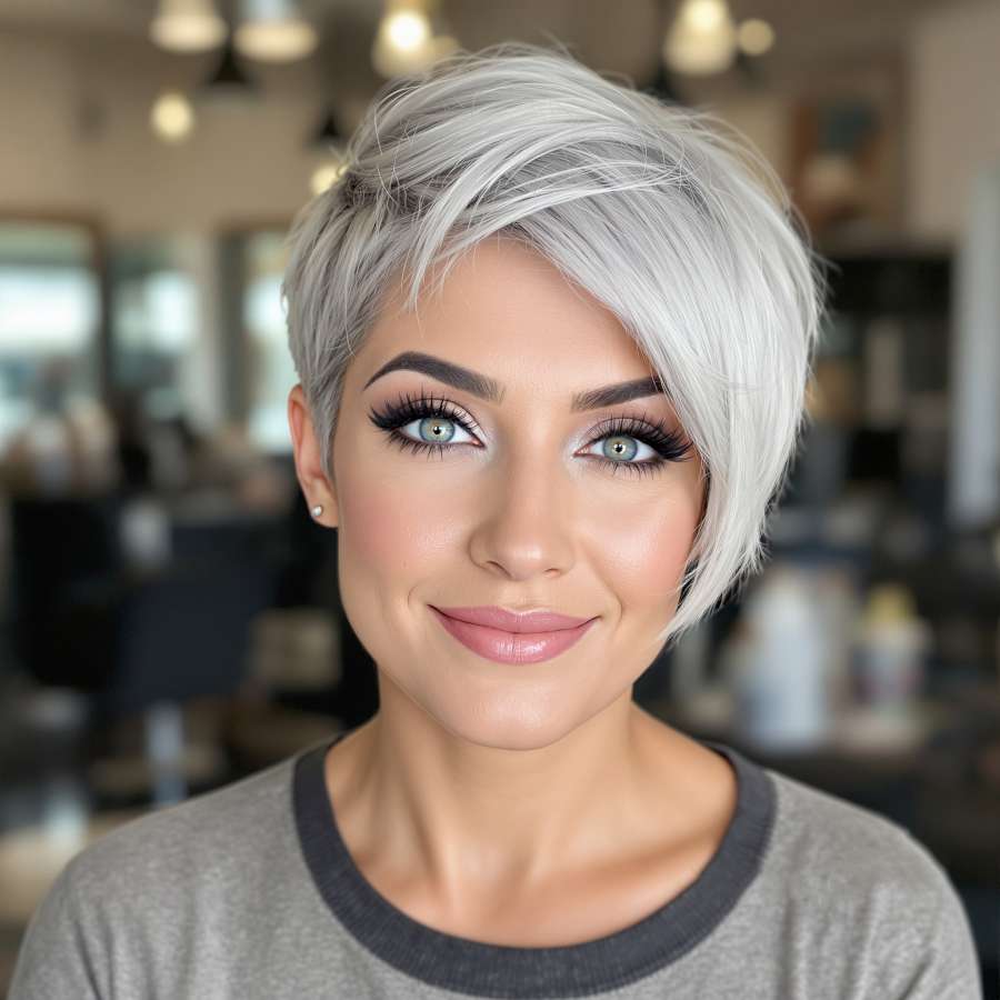 This platinum asymmetrical pixie cut is a bold and stylish choice for those who love to make a statement. The icy blonde hue adds a modern, high-fashion touch, while the asymmetrical cut creates a striking contrast between the longer, side-swept layers and the neatly tapered back. This cut is perfect for adding dimension and movement, making it ideal for fine to medium hair textures. The side-swept bangs beautifully frame the face, drawing attention to the eyes and cheekbones, while the layered top provides volume and texture. Styling is effortless—just a bit of texturizing cream or pomade is enough to enhance the natural shape and definition of the cut. Whether for a chic everyday look or a glamorous night out, this asymmetrical pixie is a sophisticated yet edgy option that exudes confidence and style.