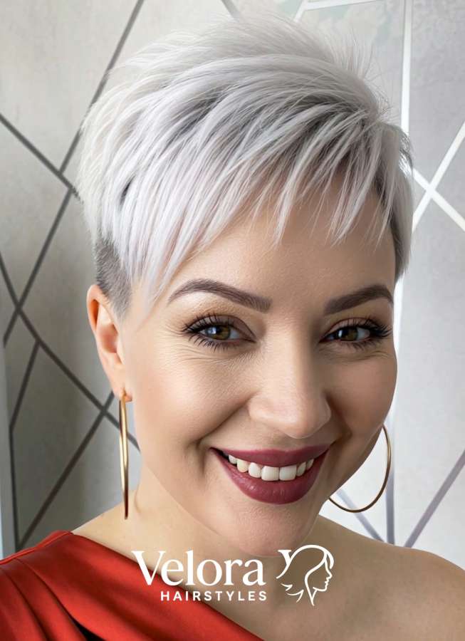 This look is a polished, salon-fresh pixie that balances sharp structure with soft movement. The nape and sides are faded close to the head to slim the silhouette, while the top is kept longer and texturized so it lifts easily at the roots. Styling is simple: blow-dry forward with a small brush, then pinch the ends with a pea-size matte paste to define the feathered tips. The platinum tone brightens the complexion, and the subtle shadow-root adds depth so the color never looks flat. It’s ideal for oval, heart, and petite round faces because the height and narrow sides lengthen the profile. If you want a short cut that photographs beautifully and looks “done” with minimal effort, this micro-fringe pixie is a standout choice. Salon maintenance is every 4–6 weeks for the fade and 6–8 weeks for a tone refresh.