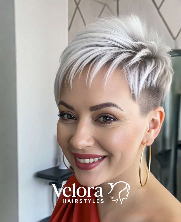 Here, the volume is focused at the crown and directed diagonally toward the face, creating a playful yet controlled sweep. The undercut sides carve out a clean outline that makes earrings and cheekbones pop, while the longer top adds height for a chic, elongated effect. Ask your stylist for a clippered fade with scissor-over-comb blending into a layered top, then internal point-cutting for weight removal. At home, rough-dry upward with your fingers and set the shape with a tiny amount of cream or texture spray so the hair stays touchable. The icy shade lifts the overall look, but the natural-looking shadow-root reduces maintenance and keeps the color dimensional between appointments. This style suits fine-to-medium hair that needs extra lift and flatters heart and oval face shapes. It’s an excellent choice if you want a short cut that feels fashion-forward without sacrificing softness.