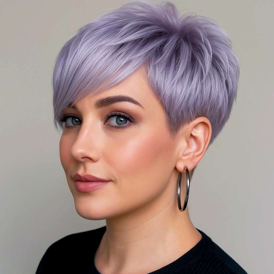 This soft-textured lavender pixie cut combines elegance with a touch of rebellion. The side-swept bangs frame the face delicately, ideal for accentuating cheekbones and eyes. The layers add volume and dimension, making it suitable for fine to medium hair. The pastel lavender hue offers a refreshing alternative to traditional hair colors, perfect for those who enjoy expressing themselves through style. This cut is especially flattering for oval and heart-shaped faces and works well for both professional and casual settings. It requires minimal maintenance—just a touch of wax or pomade to enhance the layers.