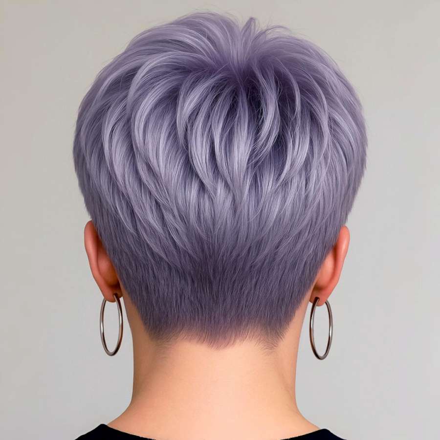 The rear view of this modern lavender pixie reveals intricate feathering and a tapered neckline that blends seamlessly with the crown volume. The feathered layers create texture and movement, adding sophistication to the style. This cut is ideal for those who want their hair to look effortlessly styled from every angle. The pastel lavender tone adds femininity and freshness, complementing the elegant structure of the haircut. It’s perfect for women who want to maintain a neat, polished appearance with minimal effort. A light-hold hairspray is all you need to preserve its shape.