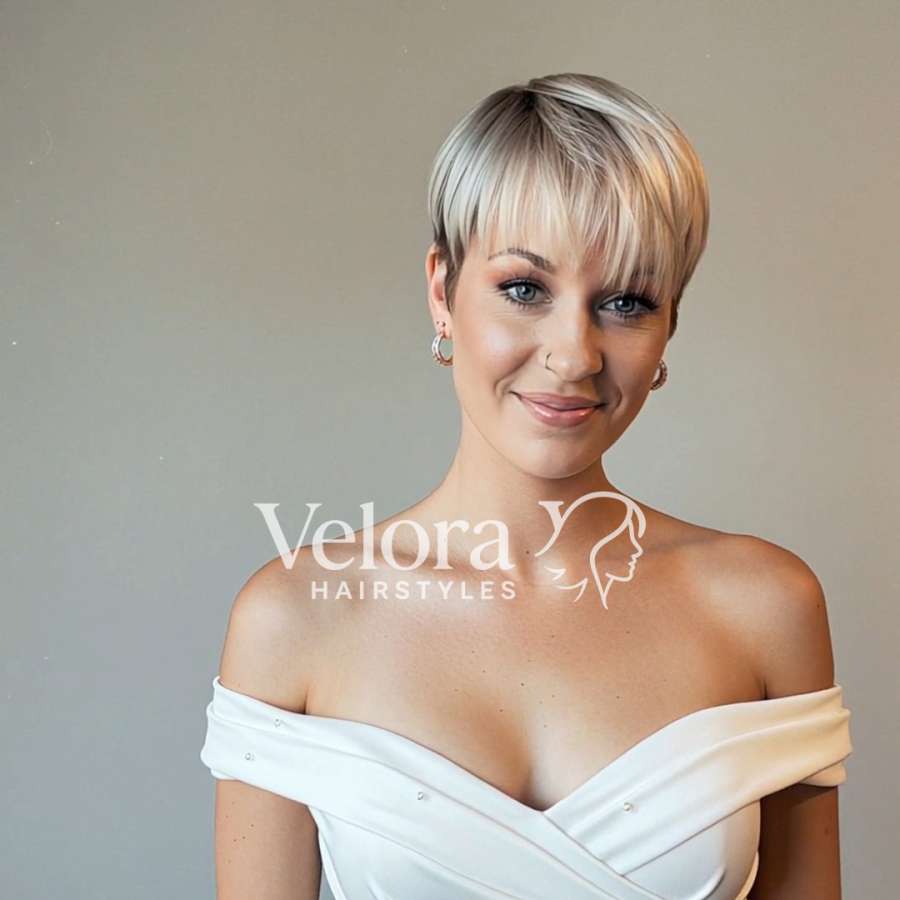 The front view of this elegant pixie cut highlights the perfect balance between sophistication and softness. The layered front fringe gently brushes the forehead, drawing attention to the eyes and cheekbones. This hairstyle is ideal for women seeking a confident, stylish look that remains feminine and easy to maintain. The blonde tone adds a radiant glow, especially under natural light, making it a perfect choice for fair or cool-toned skin. With minimal daily effort, it can be styled sleek for formal events or tousled for a more casual, effortless vibe. The off-the-shoulder white dress further enhances the clean and refined aesthetic, creating an image that feels both modern and timeless.