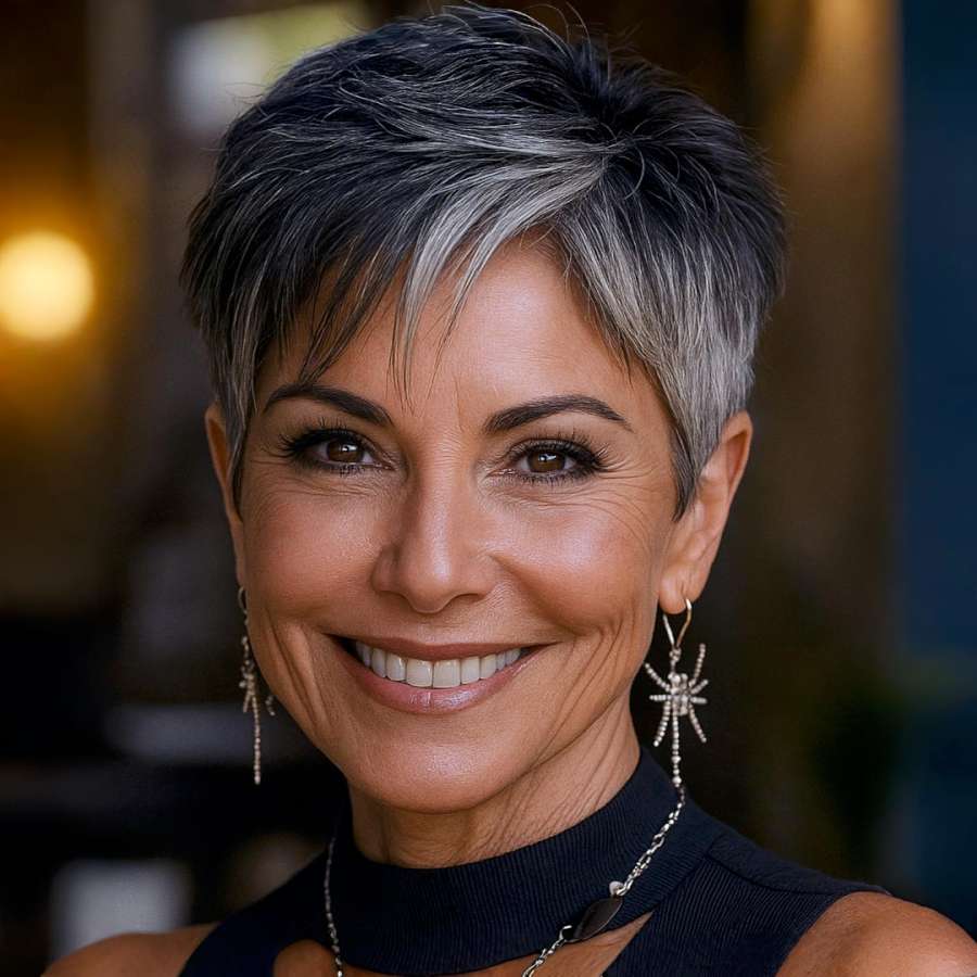 This sophisticated pixie cut showcases a beautiful harmony of volume and precision. The haircut’s crown is slightly voluminous and layered, giving the hair body without appearing too bulky. The silver highlights over a natural dark base add a touch of modern elegance, making this style ideal for women embracing their natural grays with confidence. The sides are neatly tapered, emphasizing the cheekbones and jawline. Perfect for mature women looking for a stylish yet manageable cut, this pixie works exceptionally well for oval, square, or heart-shaped faces. Its low-maintenance appeal and timeless charm make it a go-to choice for both everyday wear and special occasions.