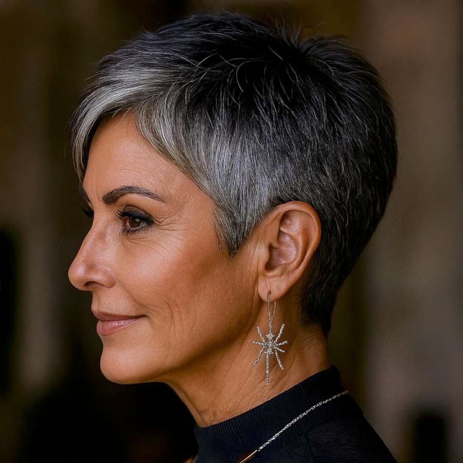 Viewed from the side, this pixie haircut reveals a meticulously sculpted silhouette that flatters the profile beautifully. The hair is cut close around the ears and nape, drawing attention to the jawline and elegant neck. Subtle silver and gray tones soften the strong angles of the cut, adding a feminine and graceful touch. This hairstyle is both stylish and versatile—ideal for women who prefer a neat look with a hint of edge. It’s particularly flattering for women with sharp facial features, enhancing their natural structure while maintaining a soft, polished finish. Whether for professional settings or casual outings, this side-profile pixie speaks of confidence and sophistication.