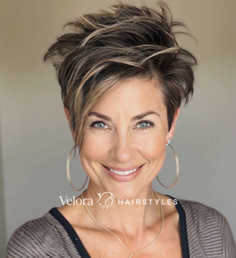 This dynamic short hairstyle is a brilliant choice for anyone who wants a modern pixie with personality and lift. The cut is built on stacked, feathered layers that create natural height at the crown while keeping the sides neat and slim, so the face remains beautifully defined. A deep side part and sweeping front section draw attention to the eyes and cheekbones, softening fine lines and flattering mature features without trying too hard. The chocolate brown base is enriched with beige-blonde highlights, placed mainly on the top and around the face to emphasize texture and movement. Styled with a lightweight volumizing mousse or texturizing cream, the strands are directed upward and slightly forward for a playful, “lived-in” finish. This pixie is ideal for women who love low-maintenance styling but still want a salon-polished look with youthful energy and timeless elegance.