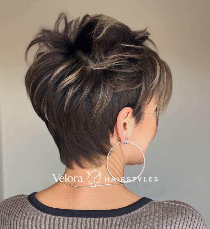 From the back, this hairstyle proves that a pixie can be just as interesting as any long cut. The nape is delicately stacked with short, graduated layers that blend seamlessly upward, giving the head a smooth, rounded shape. This smart graduation builds fullness through the crown without adding weight, making it a fantastic option for fine or medium hair that needs a boost. The longer upper layers are lightly razored or point-cut to encourage movement and airiness. Blonde streaks sweep through the dark base in fine ribbons, following the curve of the crown and emphasizing the three-dimensional shape. The finish is polished yet relaxed, with a soft, feathered edge that looks sophisticated from every angle. This stacked pixie works beautifully for busy women who want a hairstyle that looks styled from behind, whether they are at the office, out to dinner, or simply running everyday errands.