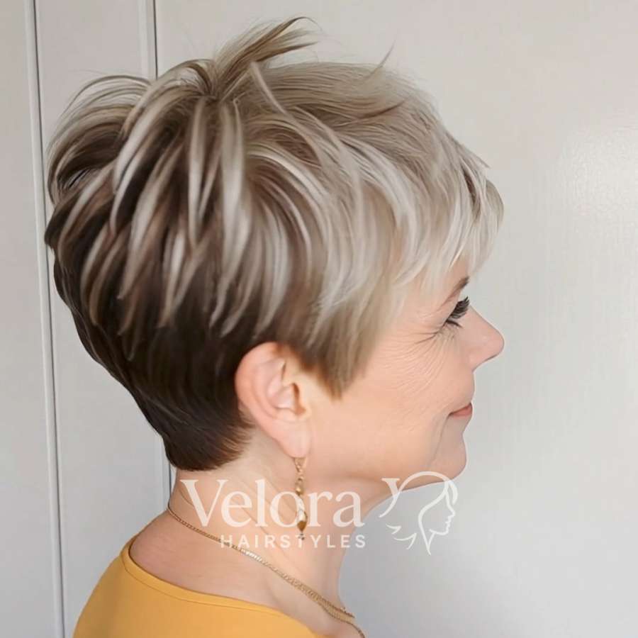 The side angle of this pixie cut highlights its sleek precision and balanced proportions. The hair’s gradual lightening from chocolate brown to platinum-silver enhances its dimensional appeal. Its side-swept shape and feathered crown create a soft frame that complements the jawline and cheekbones. This hairstyle exudes confidence and timeless beauty, making it perfect for both everyday wear and elegant occasions. Minimal effort is needed for styling — a touch of volumizing spray or pomade defines the texture and keeps it in shape all day. The smooth transition of tones not only adds depth but also gives the style a youthful glow.