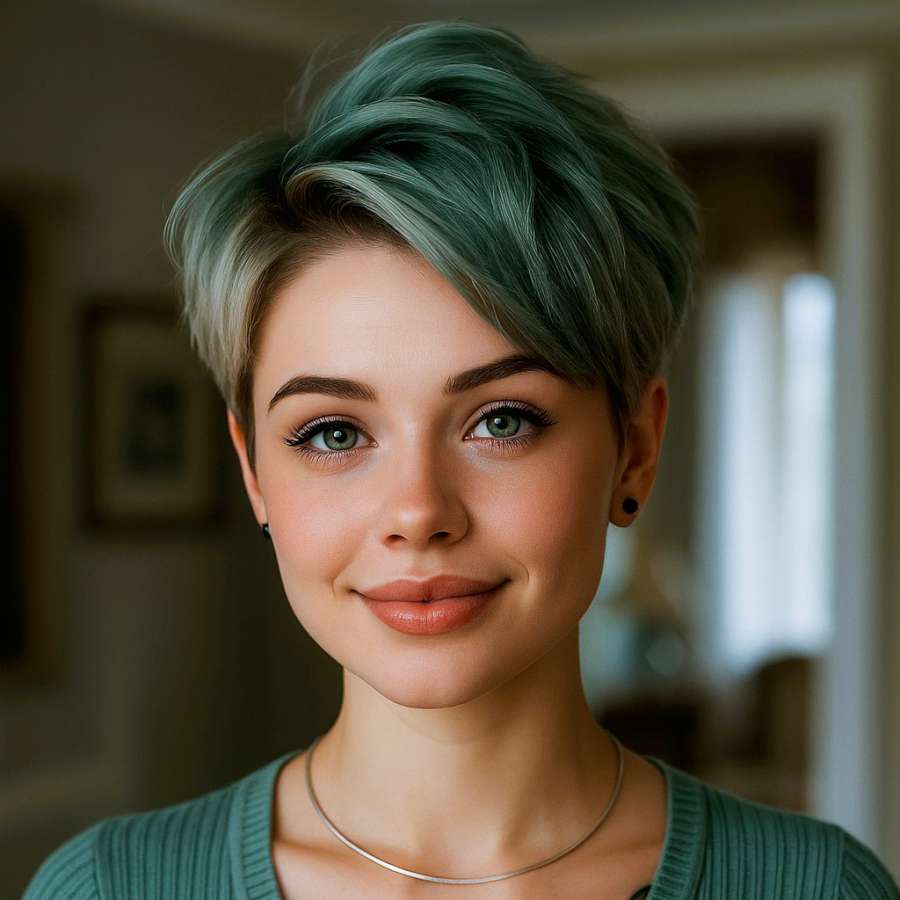 This voluminous teal pixie cut perfectly balances bold color with classic structure. Styled with a slight lift at the crown, the haircut creates an elongated silhouette that complements oval and heart-shaped faces. The front is styled to sweep gently across the forehead, creating a soft yet edgy frame. This hair color – a deep teal green over ash blonde – adds a fashion-forward twist, ideal for those who want to make a confident statement. Easy to maintain and quick to style, it suits both creative professionals and trendsetters. It’s especially flattering on medium to fair skin tones and works well with subtle makeup or minimalist accessories.