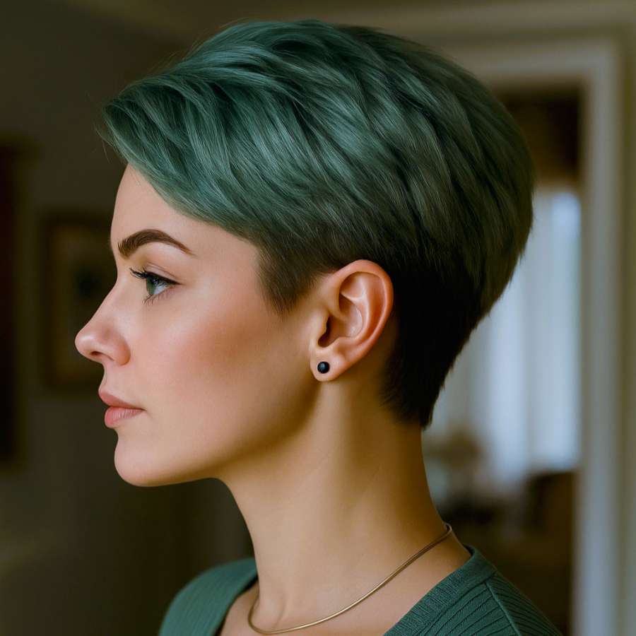 With its elegant ash-green hue and balanced shape, this pixie cut offers a clean and composed aesthetic. The even side profile, along with the gradual fade around the nape and ears, makes it a refined choice for both casual and formal settings. The top has just enough length to provide styling versatility—whether softly brushed or smoothed down. This look suits those with angular or symmetrical features, and it complements structured clothing and subtle makeup. It’s the perfect mix of classic elegance and creative flair, requiring minimal upkeep with maximum impact.