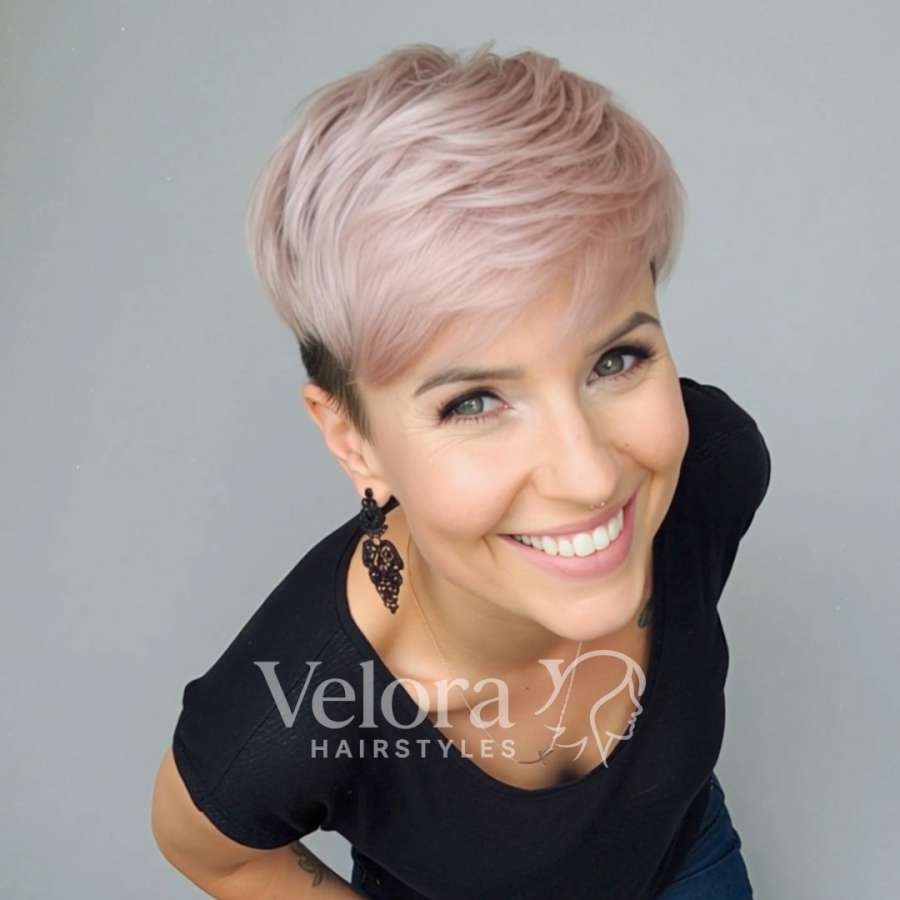 This soft rose pixie cut is the perfect combination of elegance and boldness. The delicately layered top creates movement and lightness, while the subtle undercut adds a modern edge that enhances the overall structure of the face. The pastel pink tone gives the look a gentle, feminine touch without appearing overly flashy. It’s a style that works beautifully for women with straight or slightly wavy hair who love easy styling and effortless sophistication. The layered texture can be shaped with a touch of mousse or lightweight wax to emphasize the volume. Ideal for confident personalities who enjoy low-maintenance beauty, this pixie cut radiates freshness and individuality. It’s especially flattering for oval or heart-shaped faces, offering balance and softness while highlighting facial expressions.