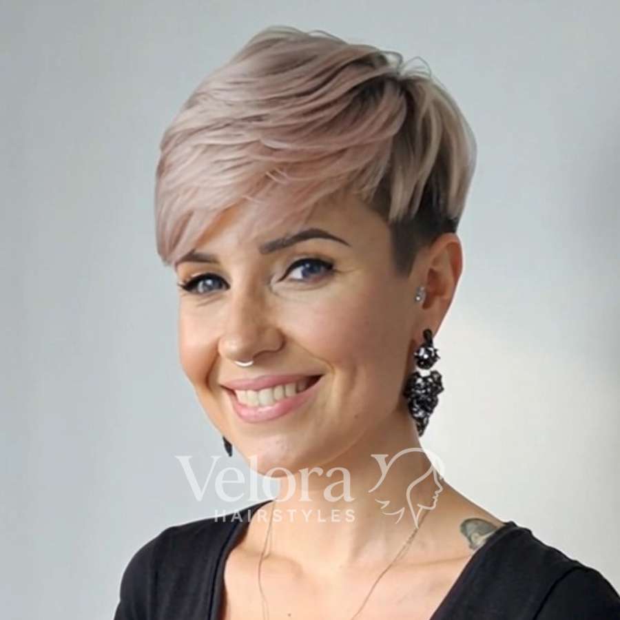The chic pastel pixie with side-swept fringe is all about modern femininity and charm. The gentle blush-pink shade complements fair complexions while maintaining a sophisticated edge that feels both trendy and timeless. The side-swept fringe adds movement and draws attention to the eyes, giving the overall look a romantic yet confident aura. This hairstyle’s precision-cut layers make it incredibly versatile—easy to maintain but always stylish. Whether worn sleek or slightly tousled, it flatters the face without overwhelming it. It’s a perfect choice for women who love short hair with character, offering a polished but approachable appearance suitable for both casual and professional settings. Its softness and texture make it ideal for those seeking a youthful yet refined transformation.