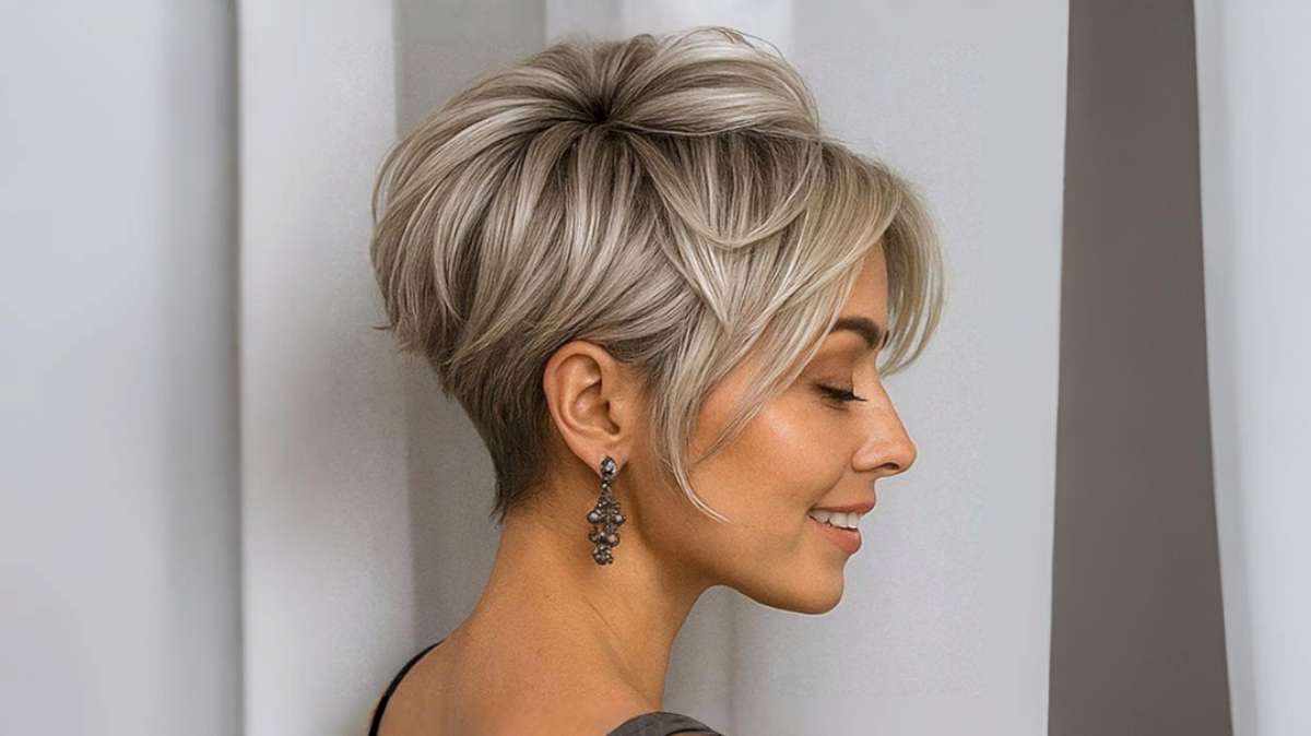 The back of this pixie cut reveals expertly stacked layers that build height and structure. The nape is cropped tight for a clean finish, while the top layers are fuller and styled to fall naturally, enhancing the overall silhouette. A blend of ashy and warm blonde tones adds dynamic contrast and highlights the layered texture. This cut is both flattering and fashionable, creating the illusion of volume even in fine hair. It’s ideal for women who enjoy structured yet feminine styles with a bit of edge. Easy to maintain and full of personality, this pixie is a standout from every angle.