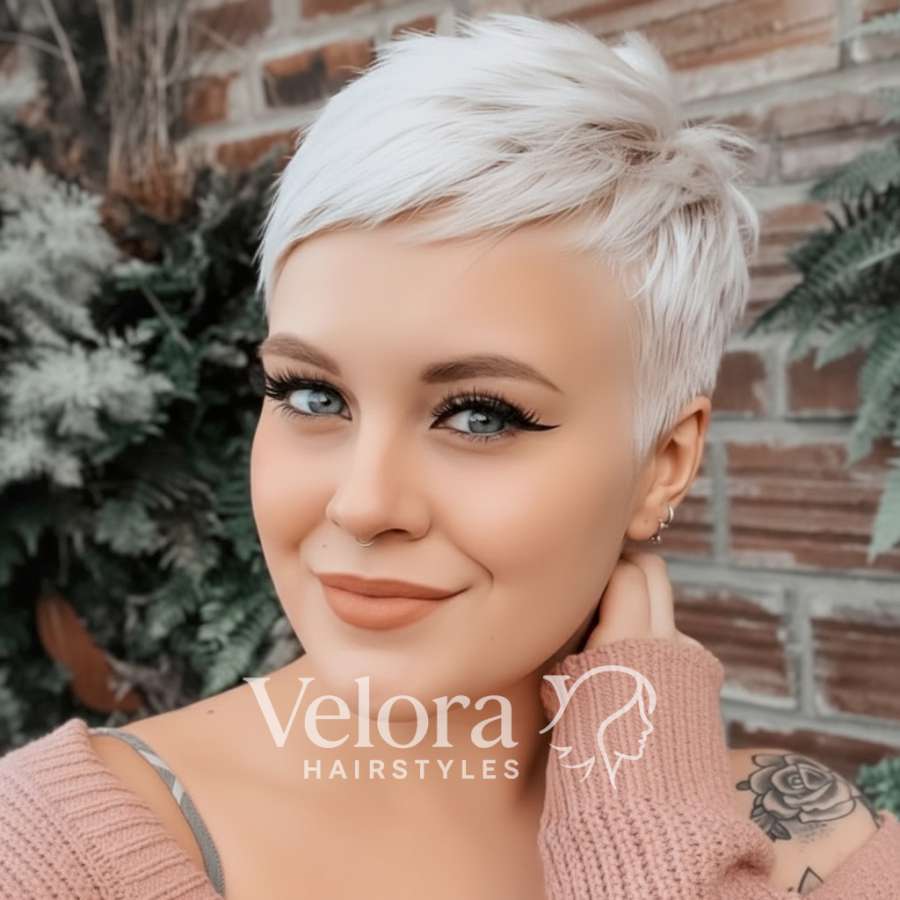From the angled front view, the craftsmanship of this pixie becomes clear. The contour around the ear is clean and snug, which sharpens the outline and places the focus on the eyes and cheekbones. On top, feather-light layers are cut to encourage natural lift without bulk; they fall into an easy diagonal sweep that creates instant polish. The platinum shade is intentionally cool, making it a flattering choice for neutral to cool skin tones, while the shadow root ensures softer grow-out. To style, apply volumizing mousse at the roots and a touch of matte paste on dry hair to define the ends. This shape is especially flattering for fine-to-medium textures because it adds density and structure. Professionals, students, and busy creators alike will love how quickly it styles and how consistently it photographs well—think everyday elegance that transitions seamlessly from casual cardigans to a sharp blazer.