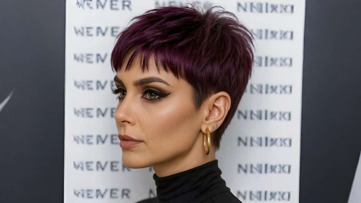 Viewed from the left, this pixie cut exudes both structure and softness. The hair is meticulously tapered around the ear, showcasing expert blending that transitions smoothly into fuller layers on top. These choppy, voluminous layers offer movement and body, while the fringe is cut to fall effortlessly across the brow for a bold yet feminine touch. The plum hue adds a touch of mystery and elegance—rich and reflective in natural light, it enhances the dimensionality of the cut. This look is especially flattering for those with strong bone structure or heart-shaped faces, as it draws attention upward while leaving the neckline clean and graceful. Easy to style and quicker to maintain than longer styles, it’s ideal for those seeking a low-effort yet fashion-forward haircut. Whether paired with bold makeup or a minimalist palette, this hairstyle makes a confident statement.