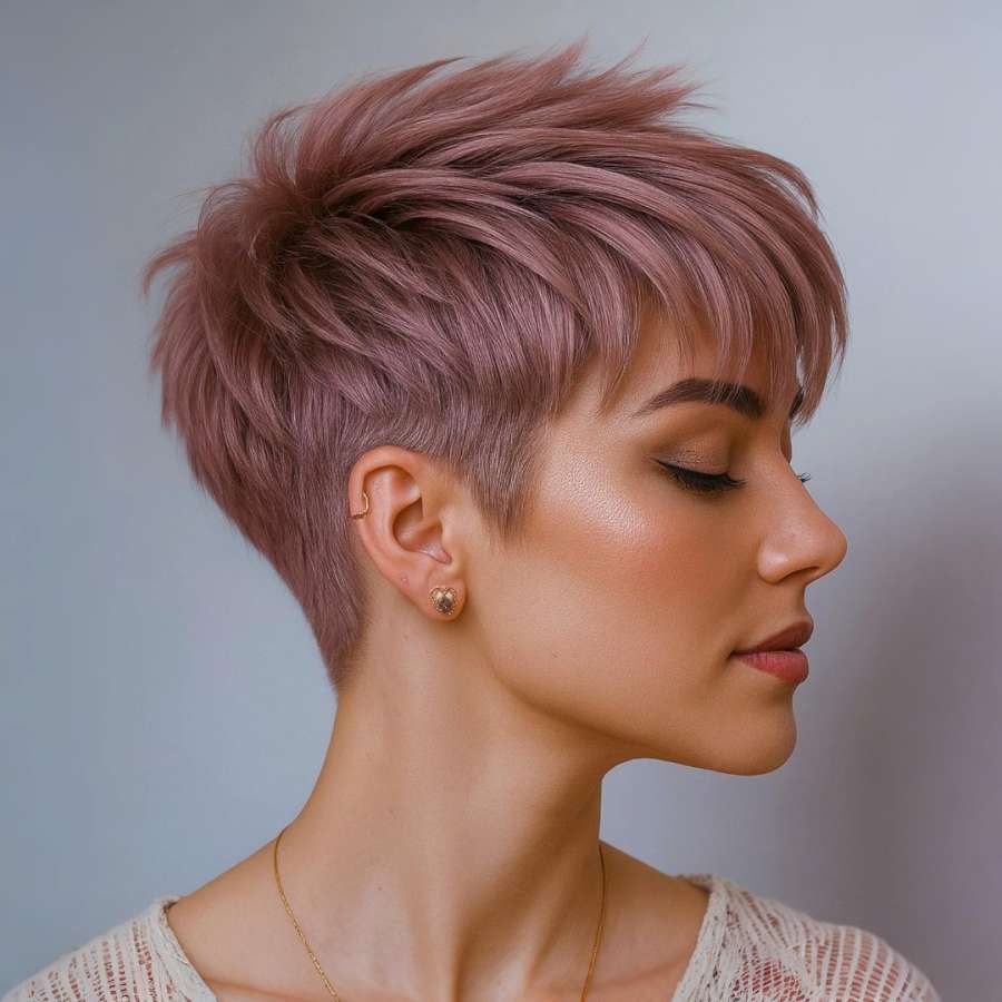 In the second image, the right-side profile brings attention to the harmony between sharp tailoring and feminine softness. The hair is sculpted to flow backward from the crown with short, tapered sides that highlight the neck and jawline. The sleek sweep away from the face emphasizes bone structure while maintaining a relaxed, chic energy. This cut is not only stylish but also low-maintenance, ideal for those with busy lifestyles or minimal time for hairstyling. The hair color’s rosy tint remains elegant and eye-catching without overpowering the overall look, making it suitable for both casual wear and professional environments.