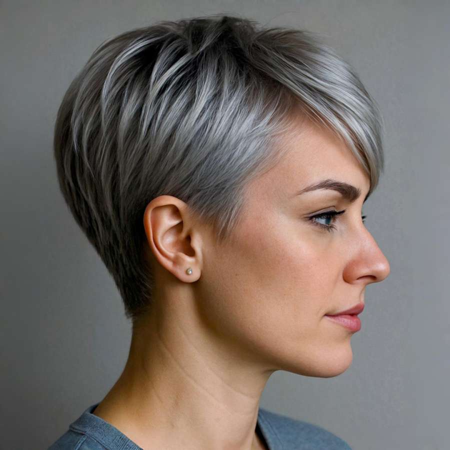 From this angle, the hairstyle emphasizes structure and clean lines. The right side of this silver pixie cut reveals a beautifully tapered design that complements a sleek, modern aesthetic. This cut is perfect for women who prefer bold yet manageable styles. The metallic silver coloring gives it a futuristic edge, while the soft texture retains a natural, touchable feel. It’s especially flattering for angular face shapes, as it highlights the jawline and cheekbones. For a woman who values polish and precision, this hairstyle delivers on both fronts.