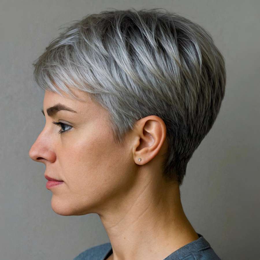 On the left profile, the artistry of the cut becomes more apparent. Feathered layers create a soft, airy effect, giving the hairstyle movement and depth. The transition from the tapered neck to the fuller top is flawlessly smooth. The silver color enhances this effect, reflecting light in a way that brings attention to the precision of the cut. It’s a versatile style that flatters most face shapes and can be dressed up or down. For women looking for both structure and softness in their short hair, this pixie offers the best of both worlds.