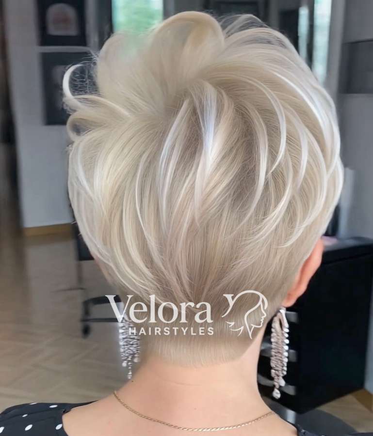 The rear angle highlights flawless graduation—short, tidy nape hair melts into longer layers that curve naturally toward the crown. This construction creates a narrow, graceful neckline and a soft, rounded back head shape. The layering is carved to encourage flow, so strands lie like satin ribbons rather than spikes. Color work remains in the cool-platinum family with delicate variation that adds movement and prevents a one-tone look. Ask for a tapered nape with blended graduation and crown layers left long enough to fold and sweep. To style, rough-dry the nape flat, then brush the crown upward and slightly forward before letting pieces fall back into place; refine the ends with a tiny touch of cream for polish. Maintenance is simple: a 4–6 week neck trim keeps the outline crisp. This view underscores the cut’s elegance—clean, professional, and incredibly photogenic from every angle.