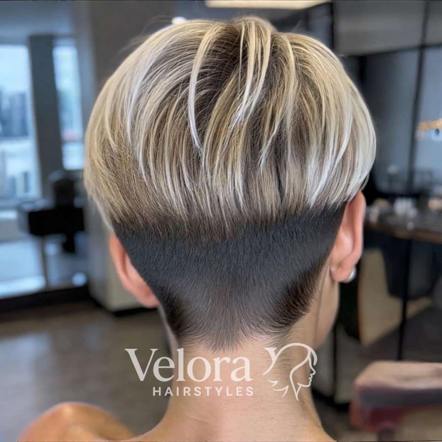 The back view of this hairstyle reveals its artistry — a precisely tapered undercut that enhances the neck’s natural line. The deep charcoal base at the nape transitions seamlessly into the platinum-blonde crown, producing a sleek contrast that defines the haircut’s modern character. The clean “V-shape” fade gives the pixie a sculpted look while maintaining a soft, feminine appeal. This design is perfect for women who appreciate refined details and want a hairstyle that looks striking from every angle. The short undercut allows for easy maintenance and a fresh appearance between salon visits. When combined with the textured top layers, the result is a style that balances creativity with elegance — perfect for bold personalities who enjoy standing out effortlessly.