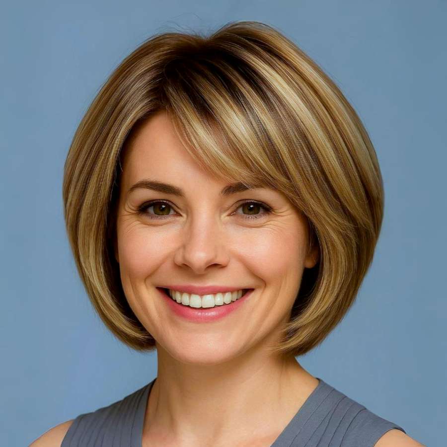 This chic bob cut radiates timeless elegance and structure. The rounded layers add natural volume and movement, while the honey-blonde tones bring warmth and brightness to the face. The side-swept bangs are delicately feathered to frame the face without overwhelming it, making this look both graceful and approachable. It’s ideal for women who prefer low-maintenance styles with a high-end finish. This hairstyle flatters oval and heart-shaped faces particularly well, offering a youthful and sophisticated charm. Whether worn sleek or slightly tousled, it delivers polished confidence every day.