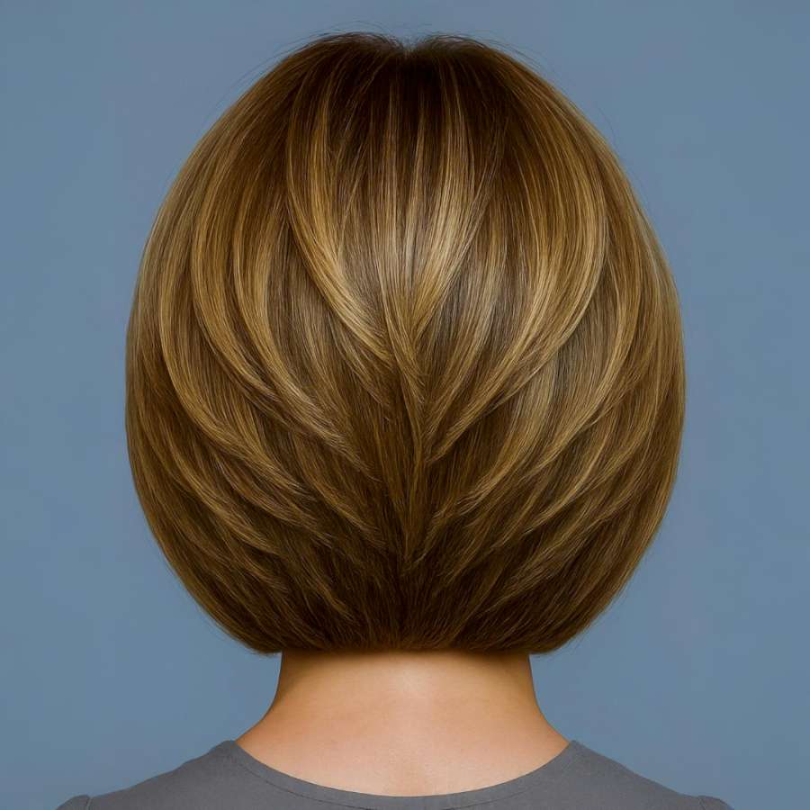 The rear profile of this bob is all about detail—layered sections that fan naturally and create a full, lifted look. The inward tapering at the nape keeps the neckline clean and chic. The golden and beige-blonde hues reflect light beautifully, adding to the visual texture and richness of the cut. This is a sophisticated yet modern hairstyle that pairs well with professional attire or elegant casualwear. Best suited for women with fine to medium hair who want to add depth and structure without sacrificing simplicity.