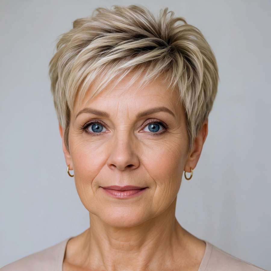 The uploaded hairstyles reflect a consistent mastery in short pixie cuts that balance precision and softness. Each angle reveals a meticulous layering technique designed to create volume, shape, and an effortlessly sophisticated look. These cuts blend various tones of blonde—from beige to light ash—enhancing the texture and making the styles glow under natural light. Ideal for mature women who appreciate practical elegance, the styles suit a wide range of face shapes and hair textures. Whether viewed from the front, side, or back, every angle maintains a structured yet natural feel, emphasizing modern femininity with minimal maintenance.