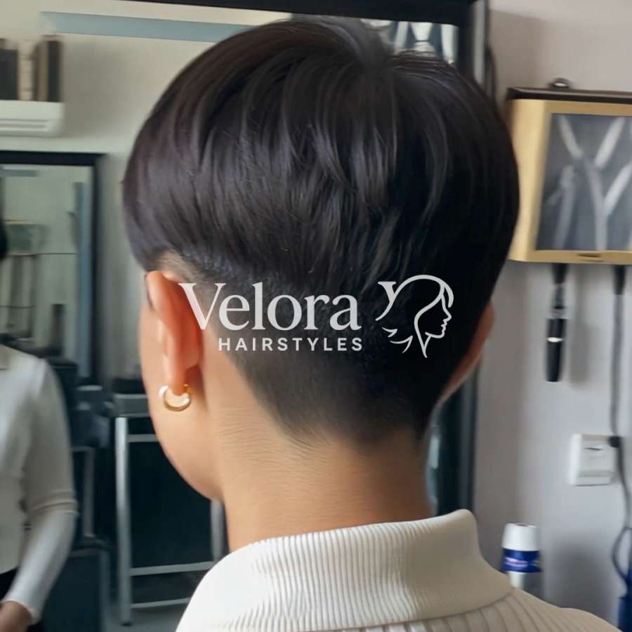 The back view of this pixie cut demonstrates perfect craftsmanship. The clean undercut at the nape provides a light and airy feel, while the upper layers maintain volume and flow. This style is ideal for those who love precision and neatness in their haircuts. The close-tapered finish enhances the neck line, giving a graceful, elongated effect. Whether paired with casual outfits or formal attire, it remains versatile and effortlessly modern—a perfect balance of structure and softness.