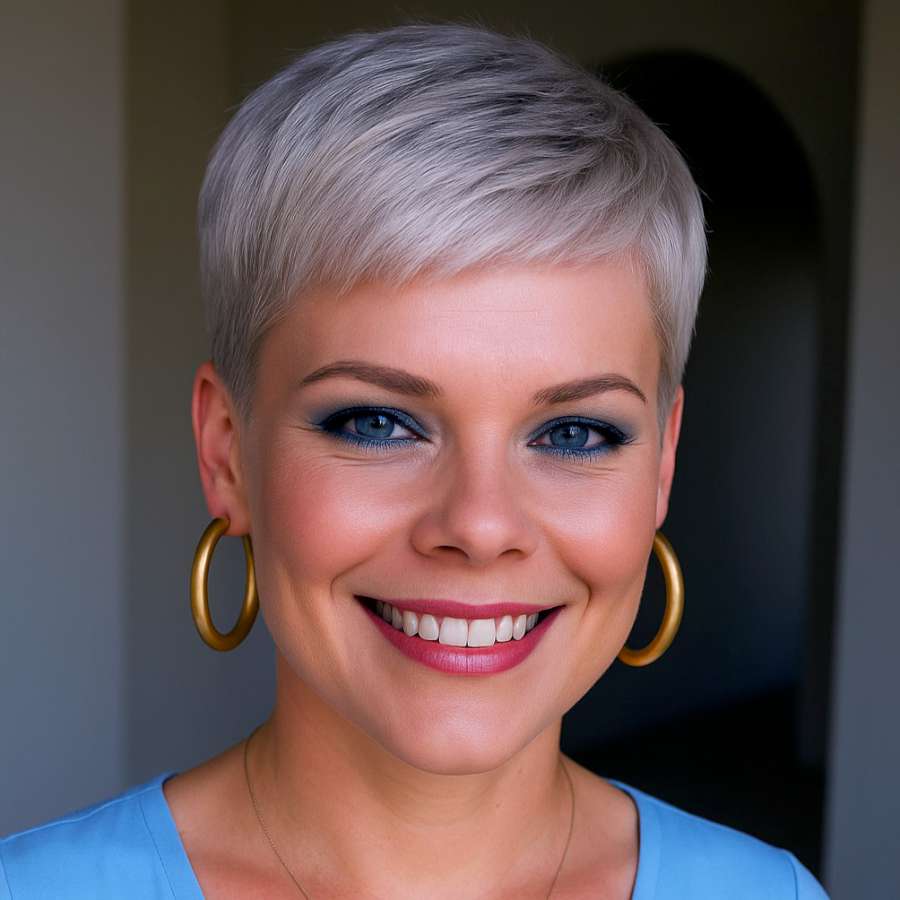 Bold yet refined, this modern pixie embraces symmetry and brightness. The metallic platinum finish reflects light beautifully, making this look especially radiant in daylight. With even-length layers and a precise cut, it’s perfect for individuals who prefer polished, easy-to-manage hair. The model’s makeup complements the hairstyle with matching cool tones, enhancing the overall effect. This look pairs well with minimalist fashion and bold accessories, as seen with the gold hoops. Suitable for women who want to make a statement while keeping their routine simple, this pixie is both glamorous and practical.