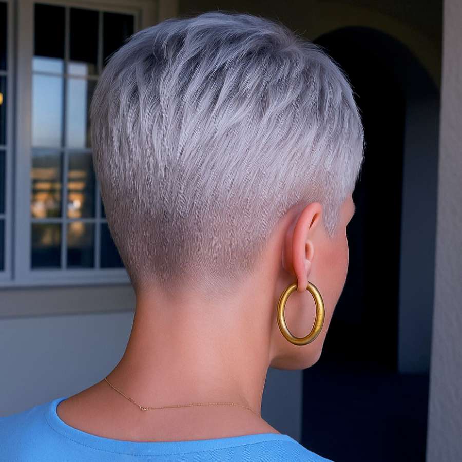 The back view of this pixie cut highlights the precision and care involved in its design. The gradual tapering enhances the natural head shape, while the layers at the top add volume and dimension. This view emphasizes the low-maintenance nature of the style—requiring little more than a quick brush-through in the morning. The consistent platinum color adds unity and sophistication. Ideal for women who enjoy crisp, tailored haircuts, this style works particularly well with fitted fashion and elegant jewelry. It offers both style and convenience in one effortlessly clean look.