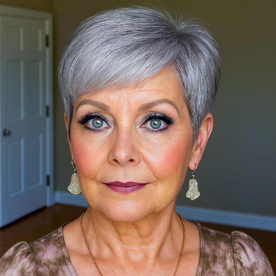 This silver pixie cut is a striking blend of elegance and modern flair. The short, layered texture enhances volume and frames the face beautifully, while the ashy silver tone adds a chic, timeless glow. Styled to perfection, this haircut works wonderfully for mature women looking for a low-maintenance yet stylish transformation. It flatters round, heart, and oval face shapes, and the silvery hue pairs well with all skin tones. The side-swept fringe adds softness to the look, while the back is cleanly tapered to give it a polished finish. This hairstyle speaks confidence and grace with every strand.
