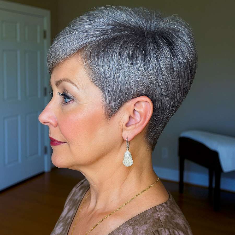 This elegant side profile reveals the sculpted beauty of a silver pixie haircut. With neatly stacked layers at the back and a subtle lift at the crown, it brings fullness and balance to the silhouette. The cool silver shade with a hint of ash tone adds modern charm and beautifully highlights the texture. Ideal for women who appreciate clean lines and sophistication, this cut is easy to maintain and perfect for everyday confidence. It draws attention to facial features and earrings, making it a wonderful choice for those who enjoy accessorizing with bold pieces.