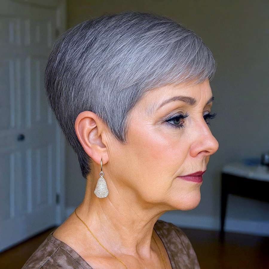A modern take on the classic pixie, this hairstyle exudes grace and structure. Viewed from the side, the cut is crafted to contour the head shape while adding fullness through fine layers. The silver color carries soft metallic undertones that shimmer subtly in the light. This haircut is perfect for women seeking simplicity with elegance. It’s incredibly easy to manage, requiring minimal styling while still appearing runway-ready. Whether for professional settings or casual outings, this refined look brings out natural beauty and sophistication.