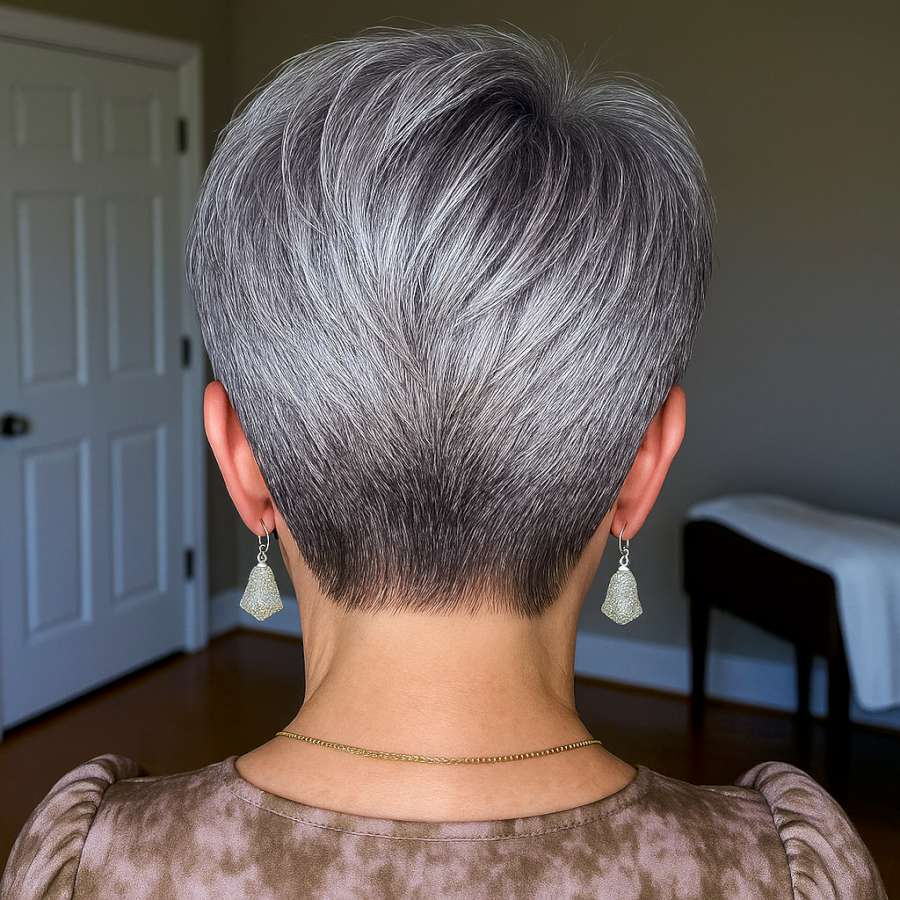 From behind, this ash silver pixie cut showcases precision and texture. The layers gradually build volume as they rise to the crown, creating a flattering and youthful silhouette. The nape is cleanly tapered, giving the style a structured yet soft finish. The color, a mix of cool silver and subtle dark roots, adds natural depth. Perfect for those seeking a stylish yet manageable short haircut, this look radiates confidence. Whether you’re turning heads on the street or simply feeling empowered at home, this pixie is a standout.